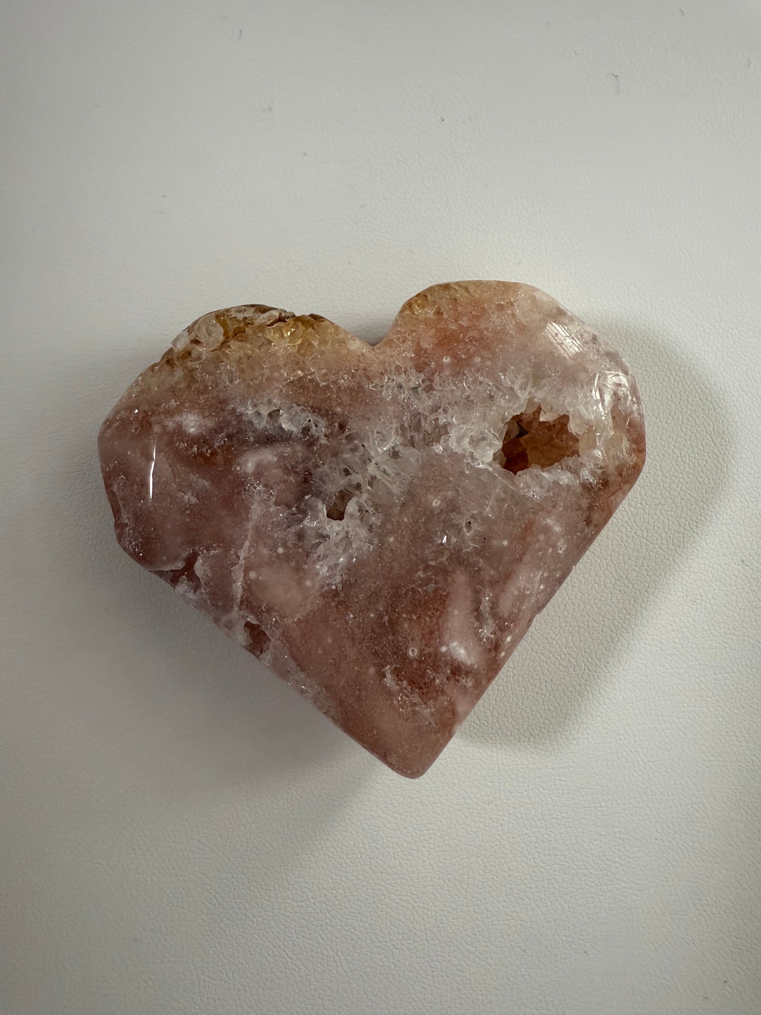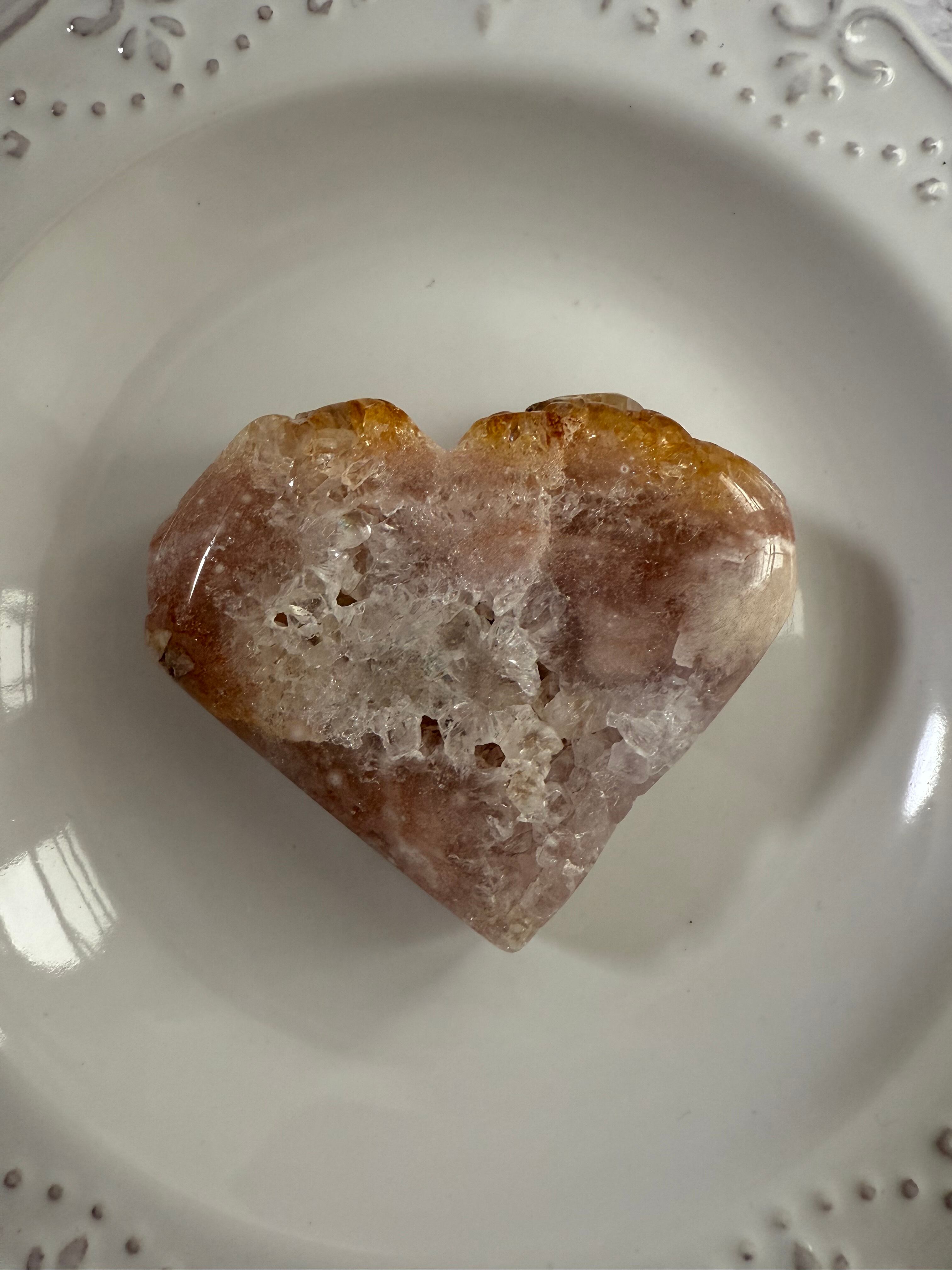 【希少】桜瑪瑙とシトリンの共生・ハートのパム(透明の台座付き)置物・天然石【少しジォード入り】