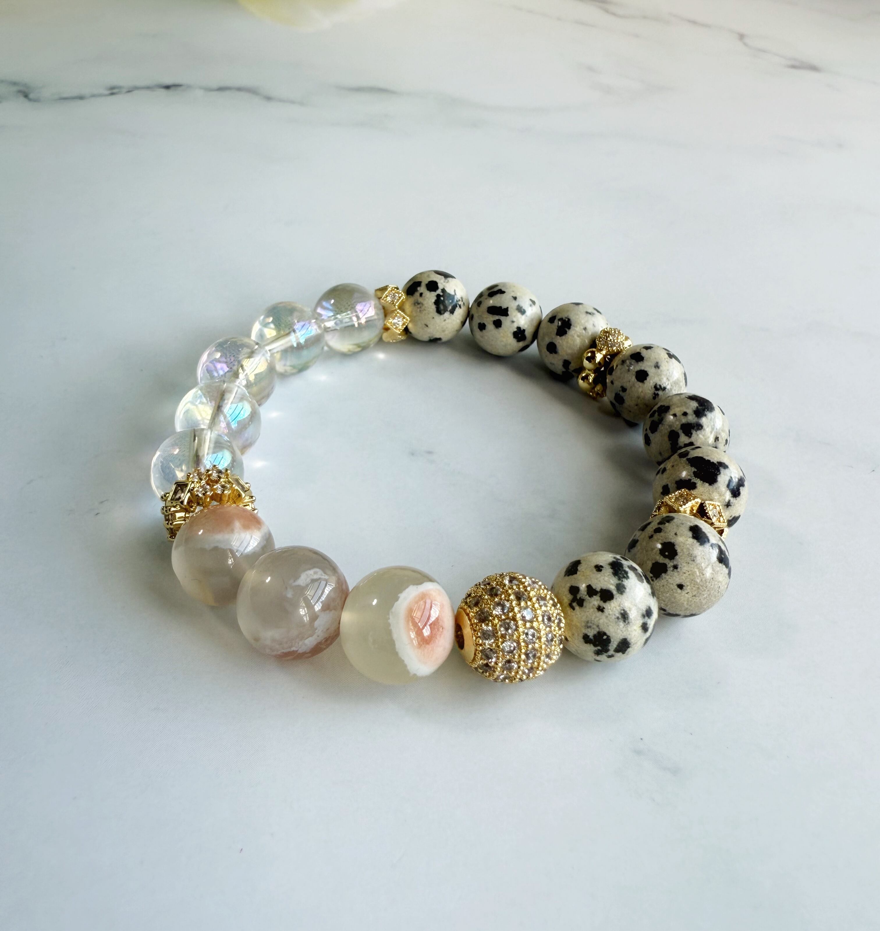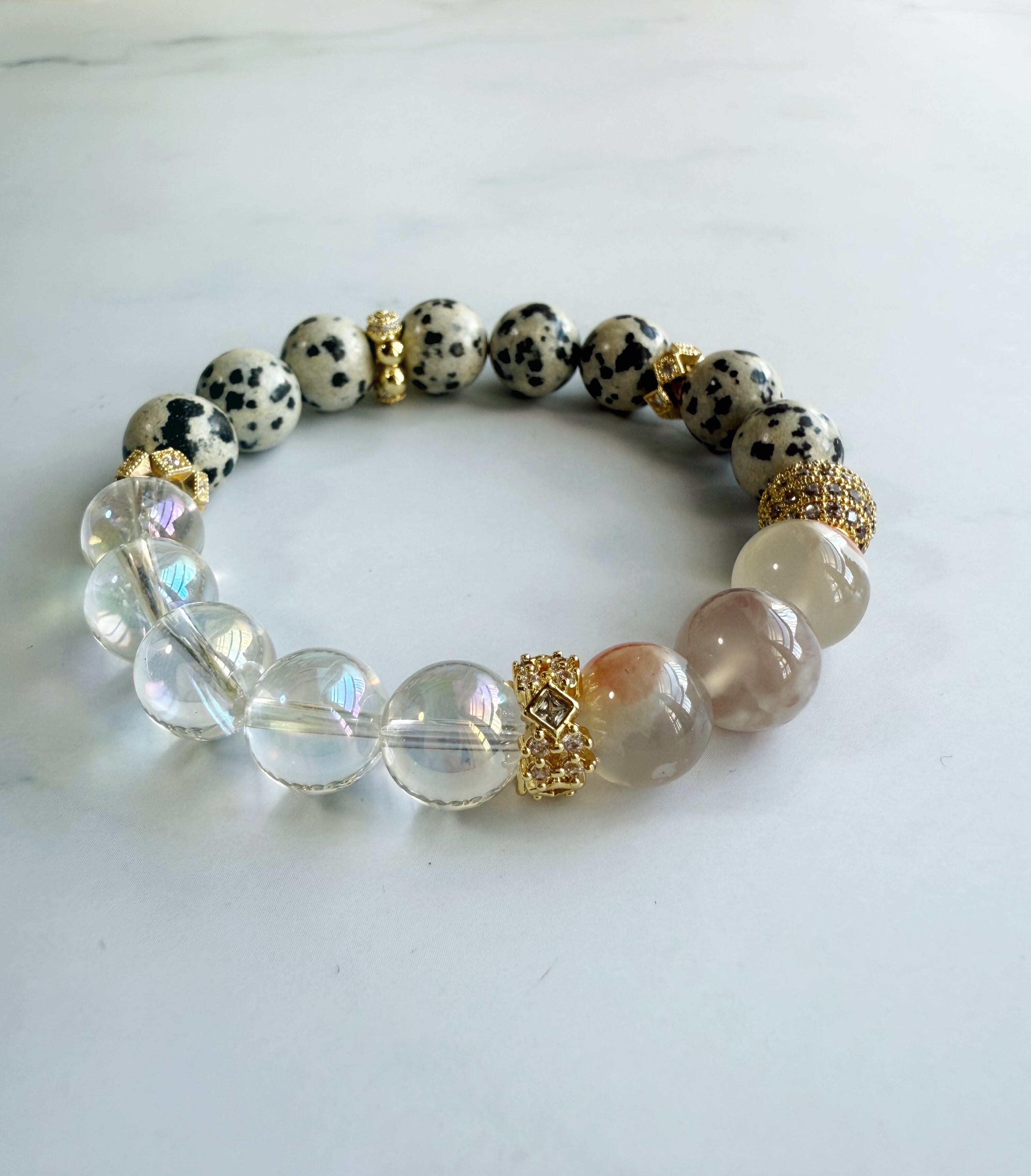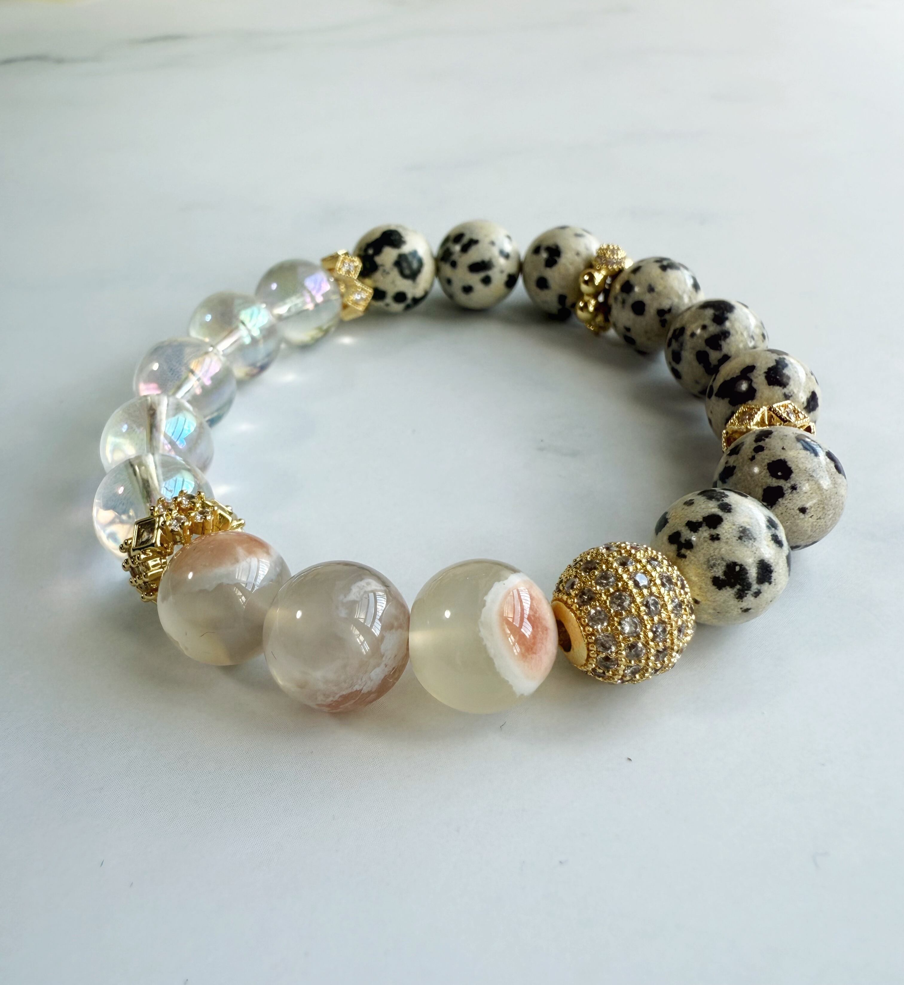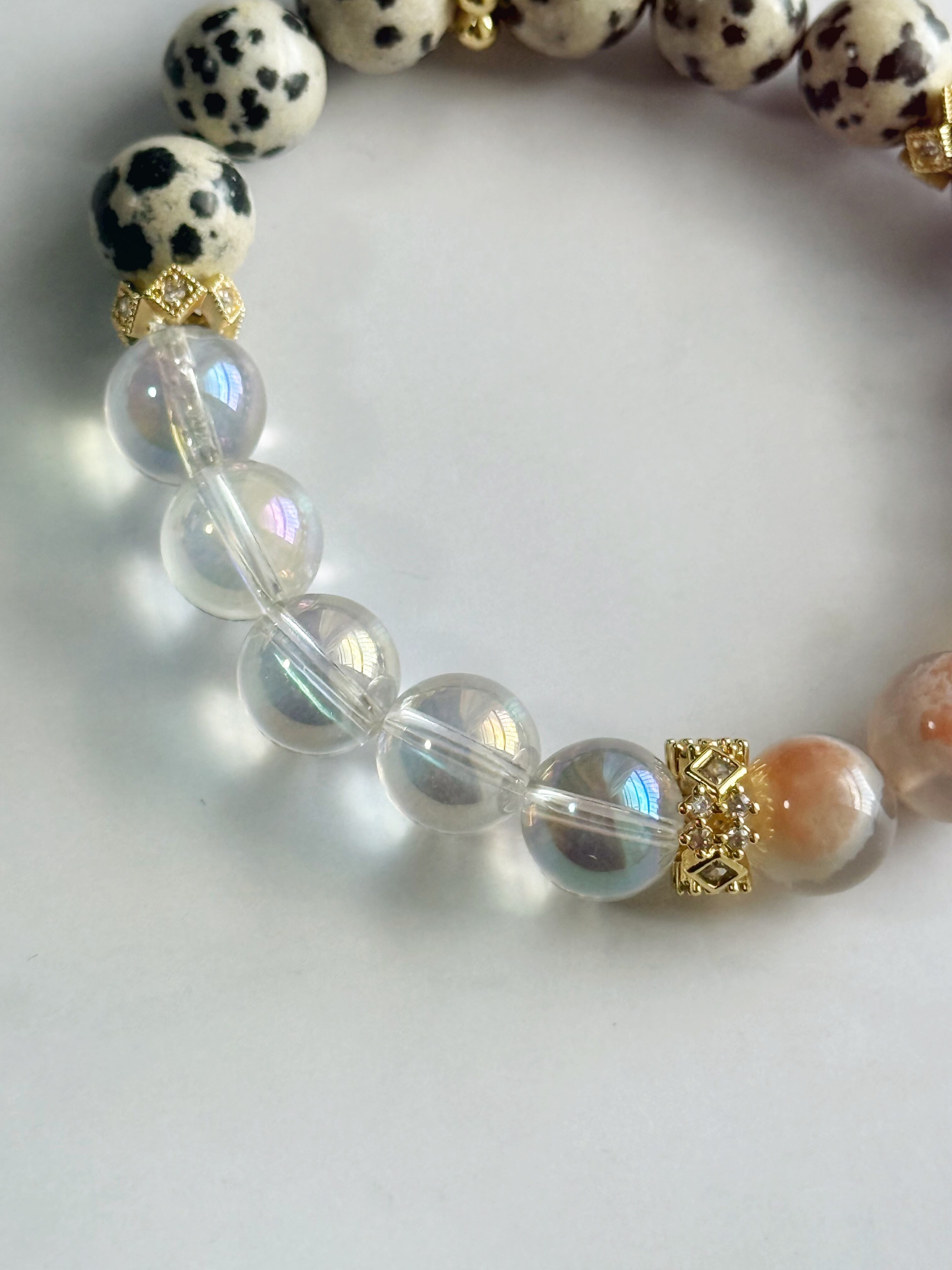Myra(ミラ)のしずく ダルメシアンジャスパー 桜瑪瑙 オーラ水晶 パワーストーン︎ 天然石 デザインブレスレット