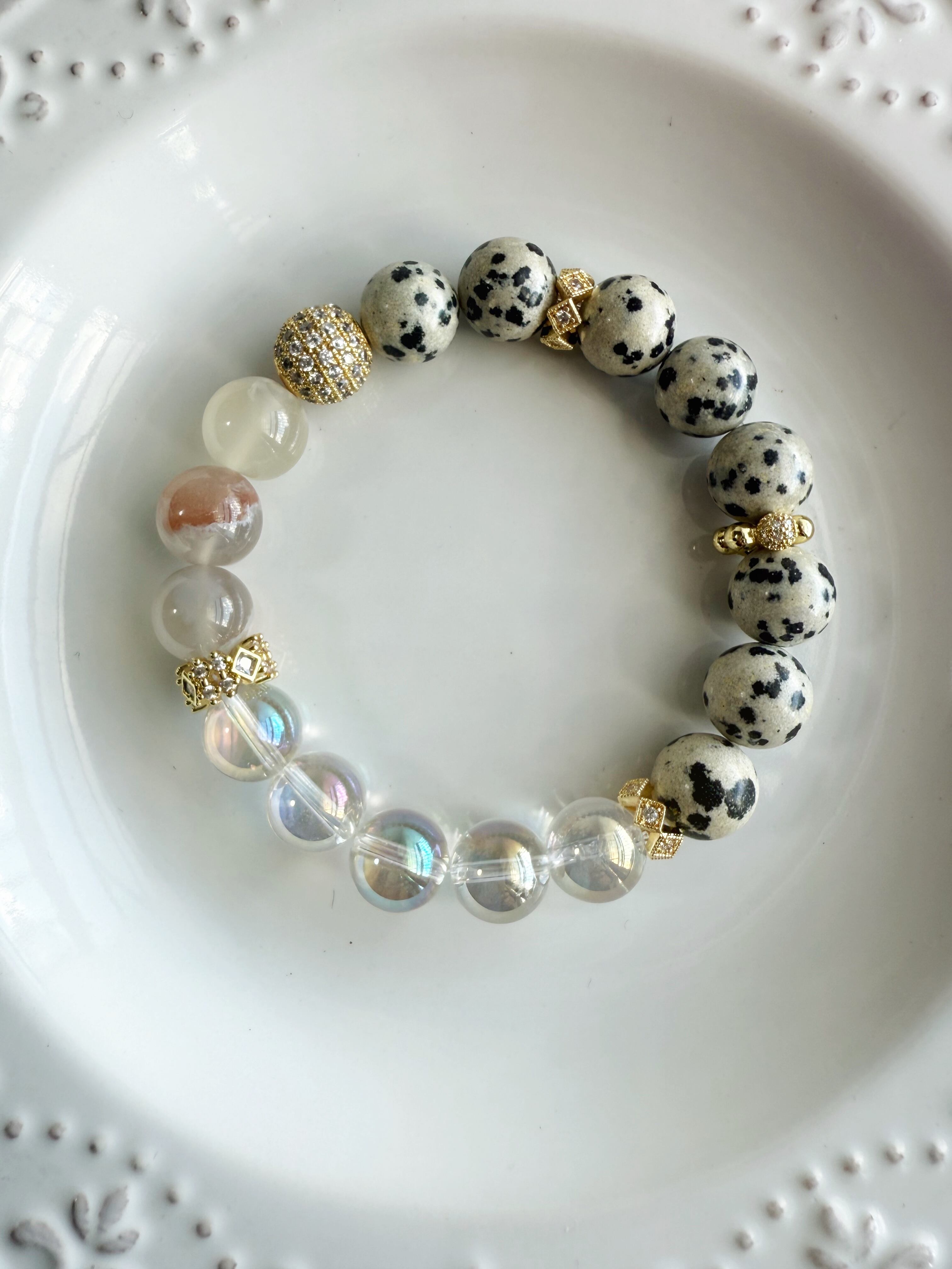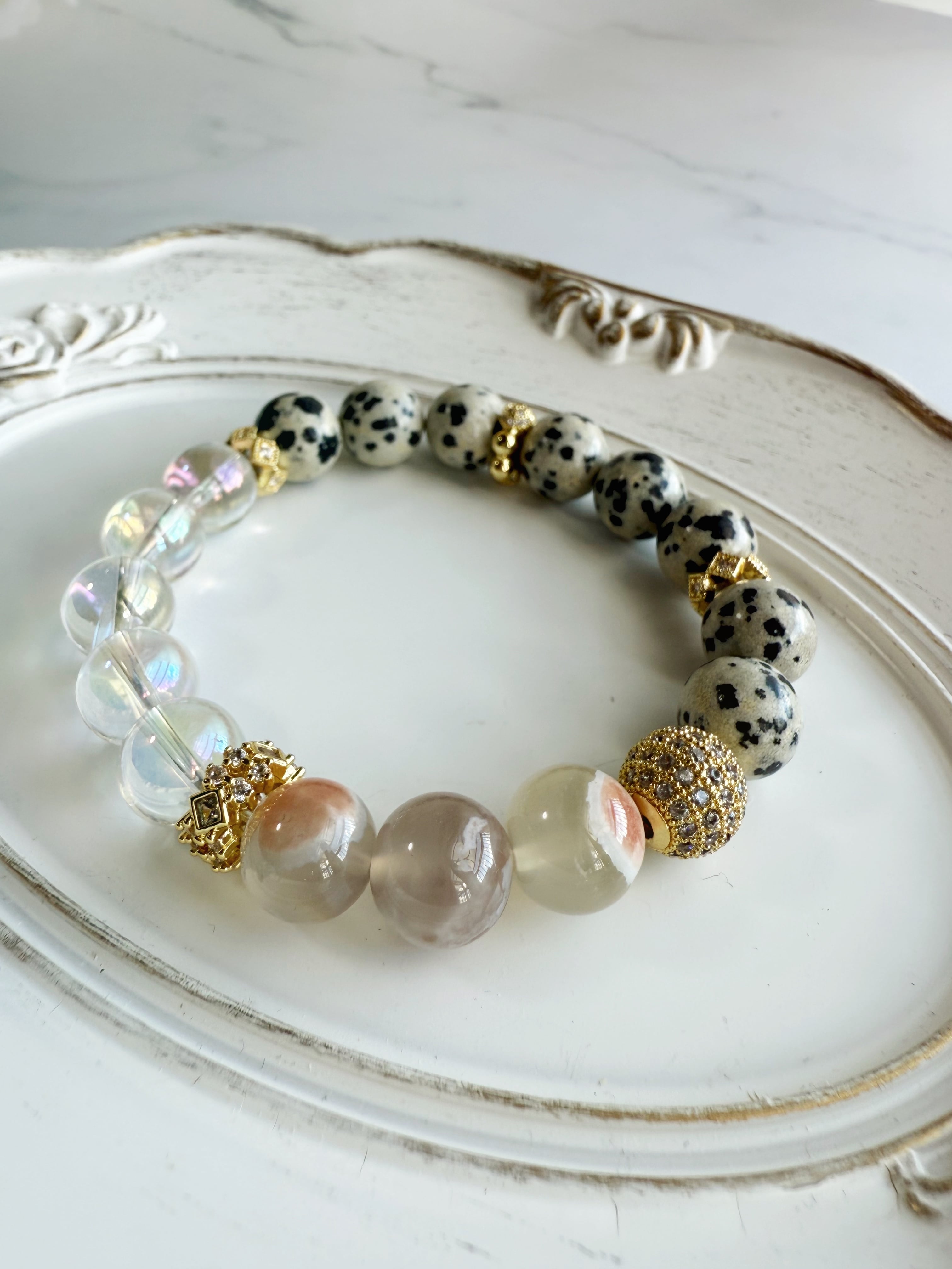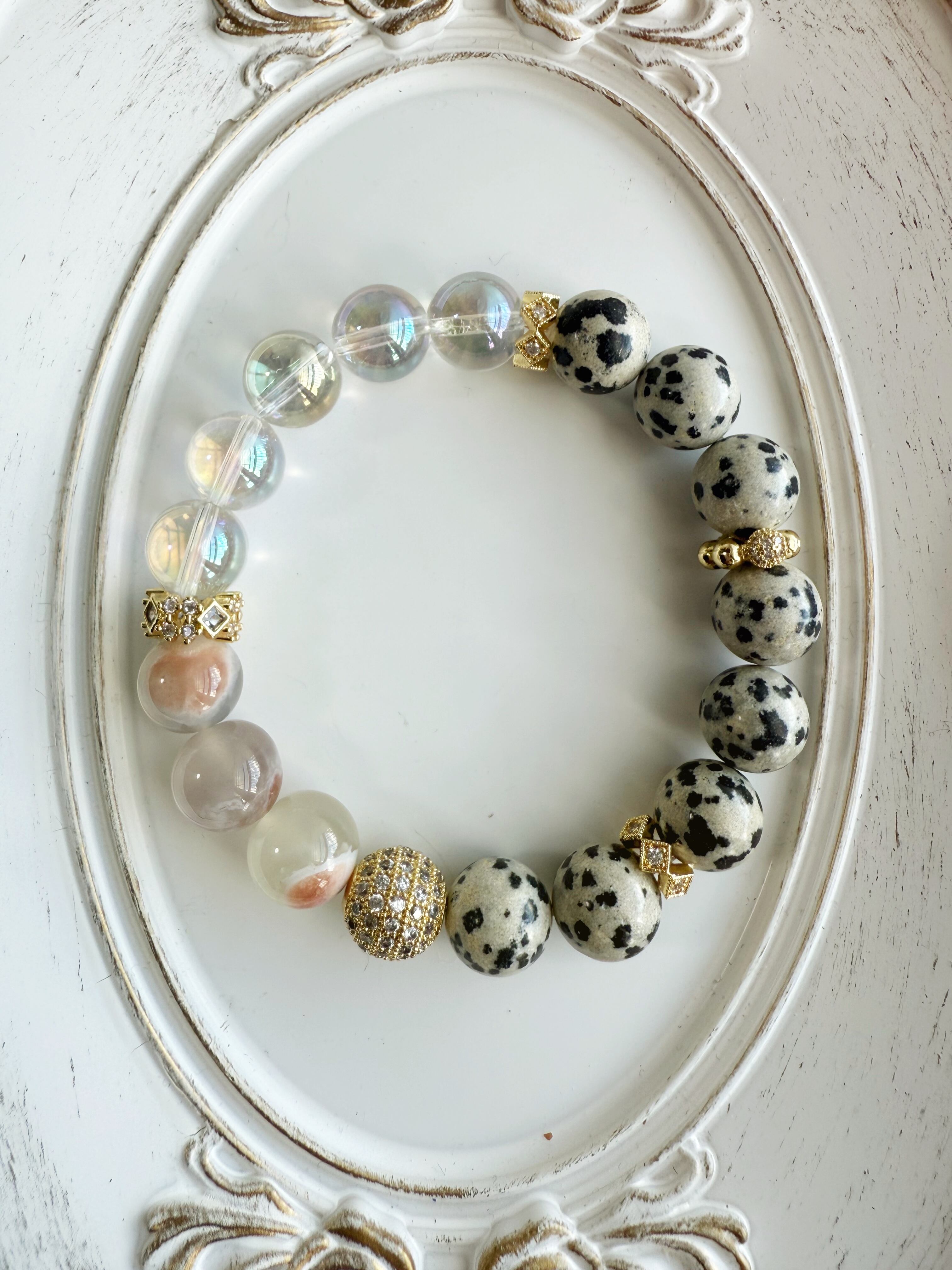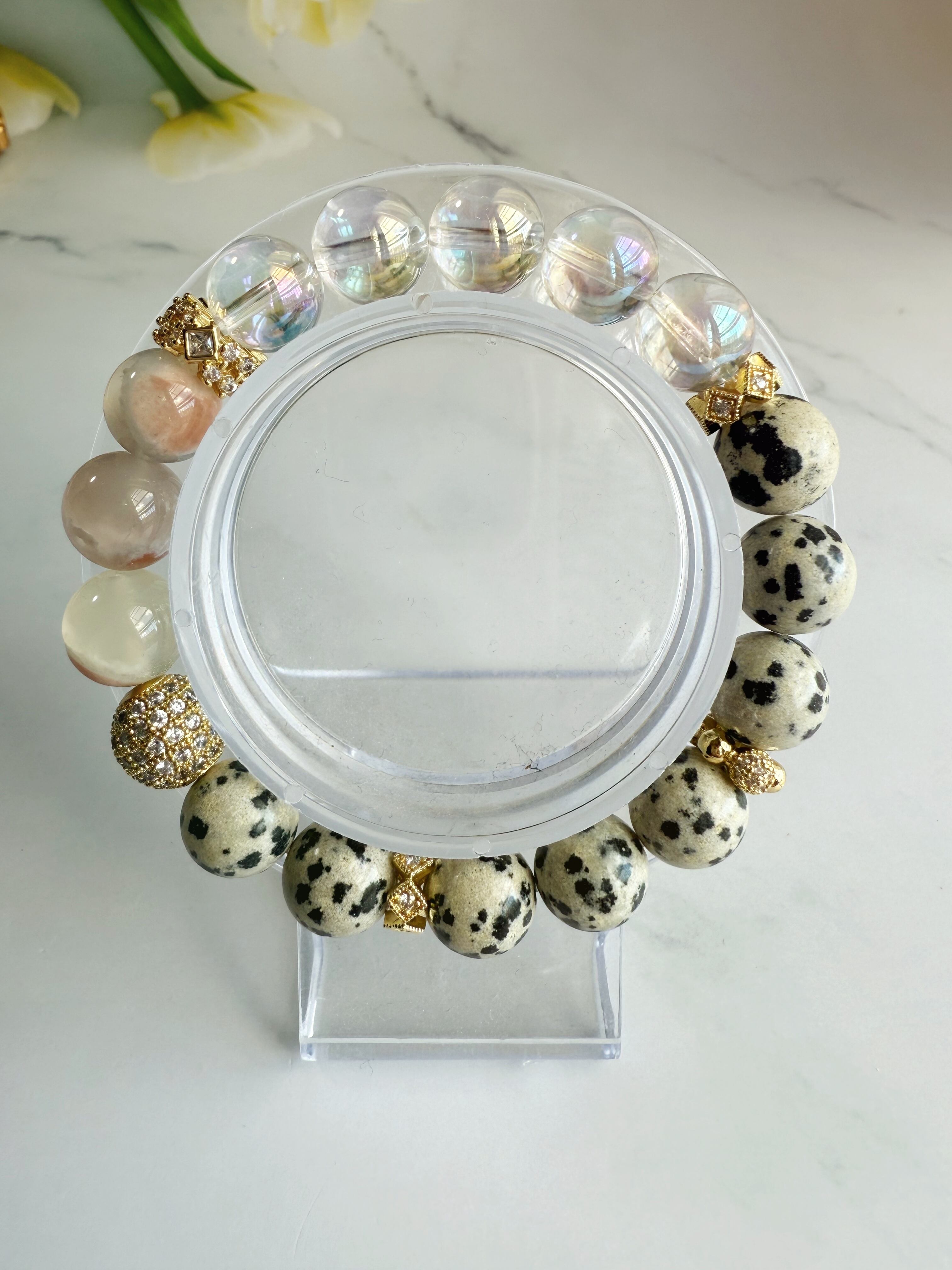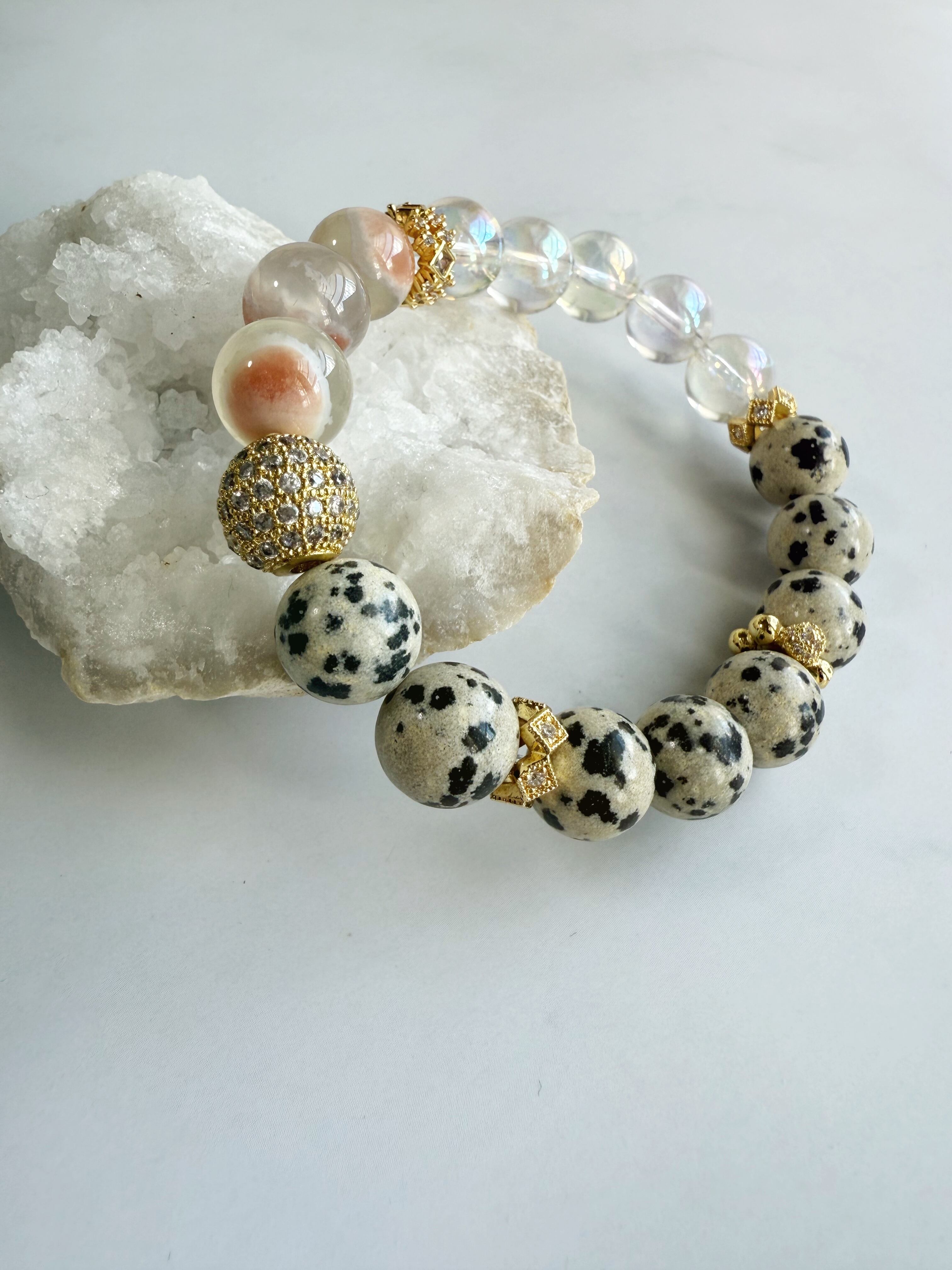 Myra(ミラ)のしずく ダルメシアンジャスパー 桜瑪瑙 オーラ水晶 パワーストーン︎ 天然石 デザインブレスレット