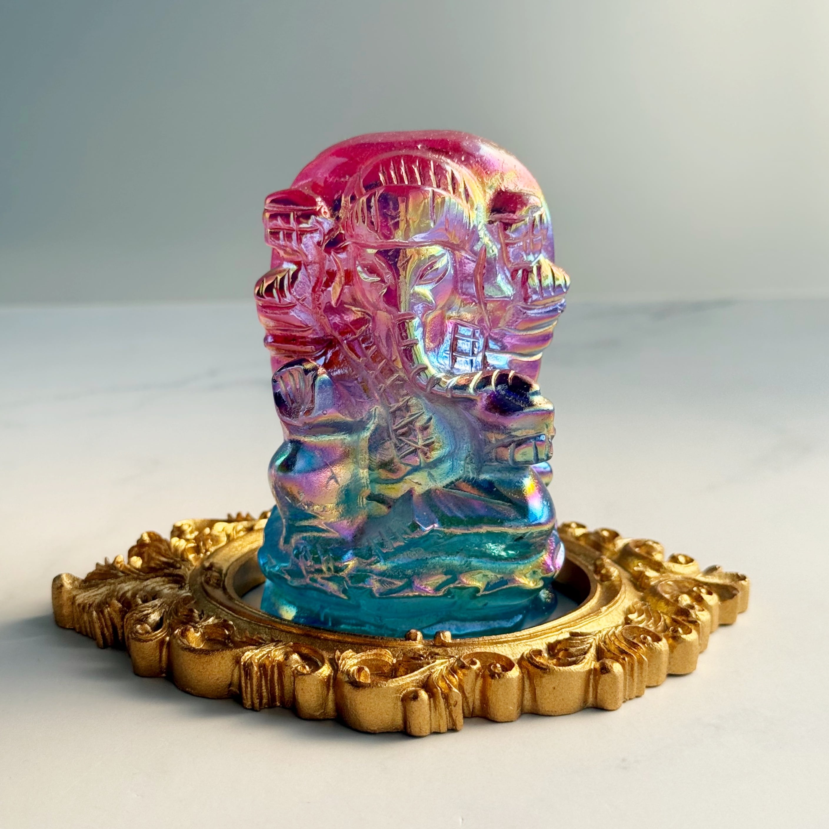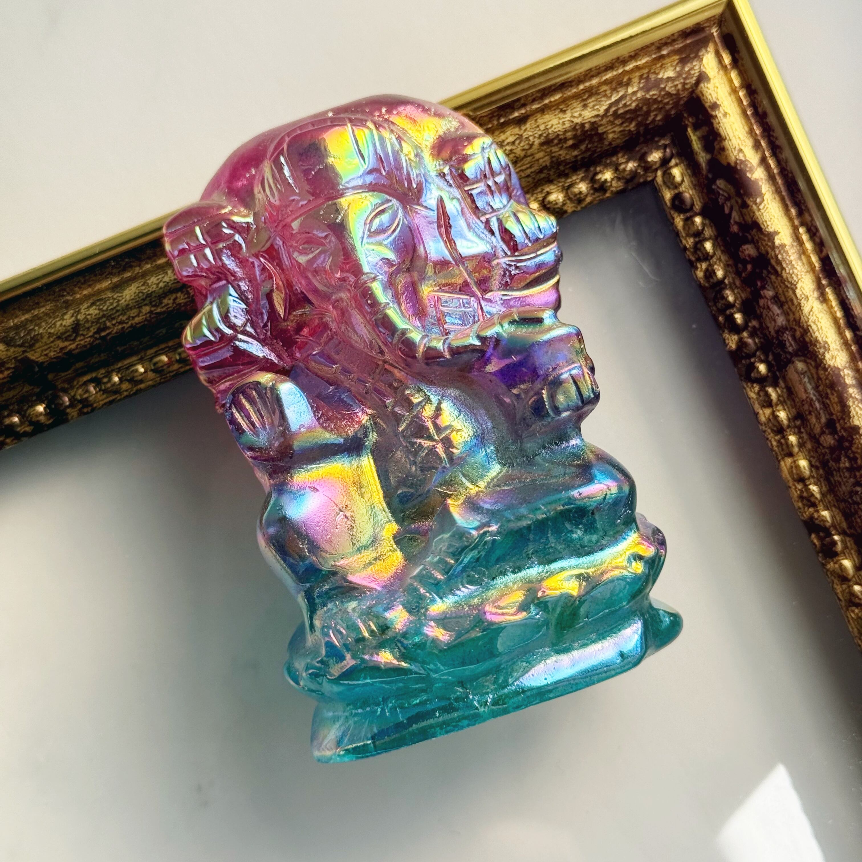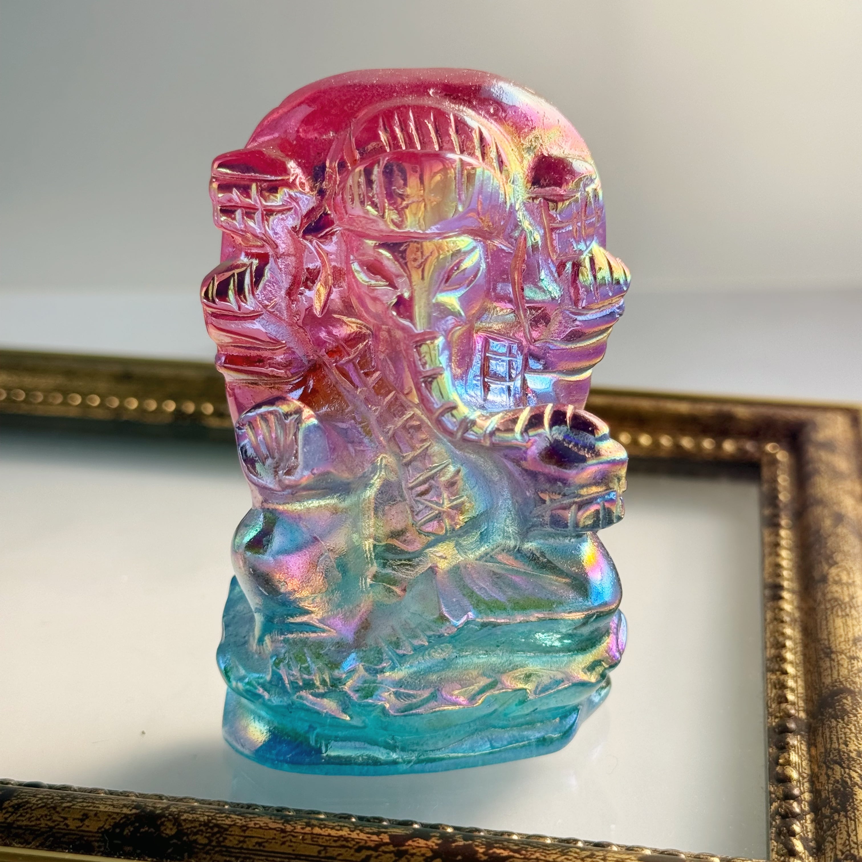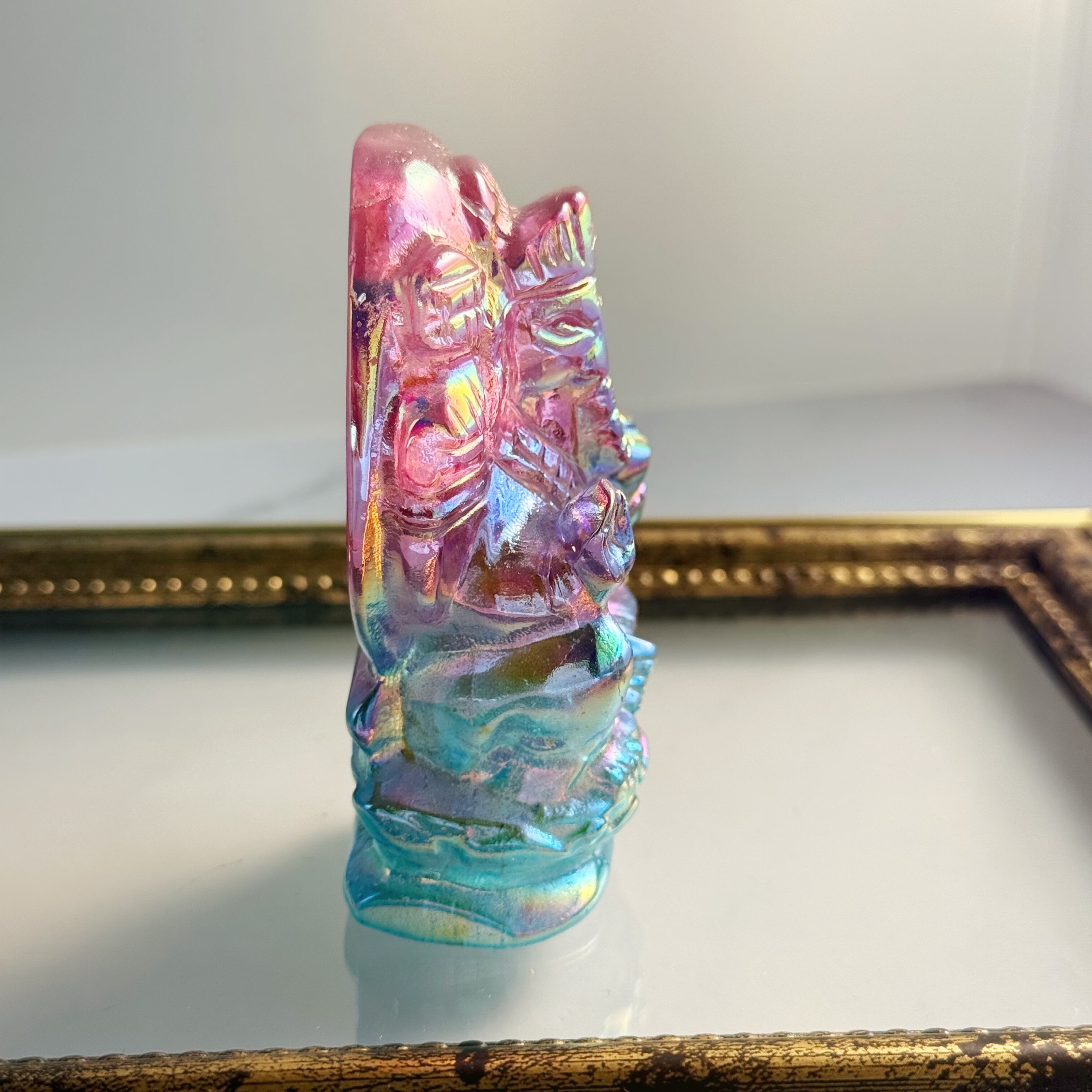 透明な水晶に、虹色のオーラ加工をほどこしたガネーシャ像。