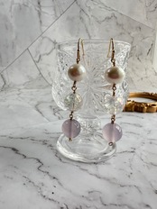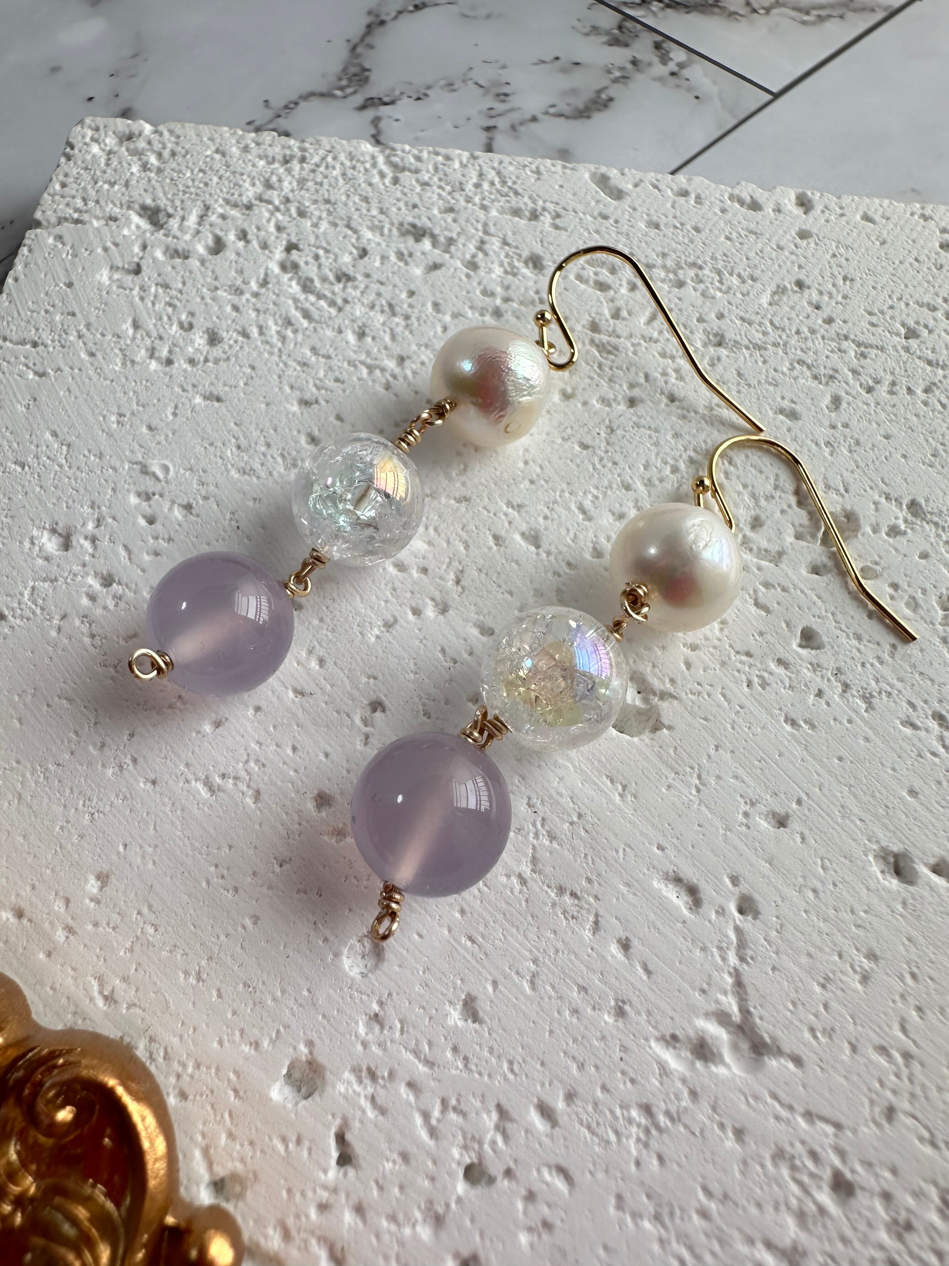 シンプルなゆらゆらデザインピアス 天然石 パープルカルセドニー パール オーラクラック水晶